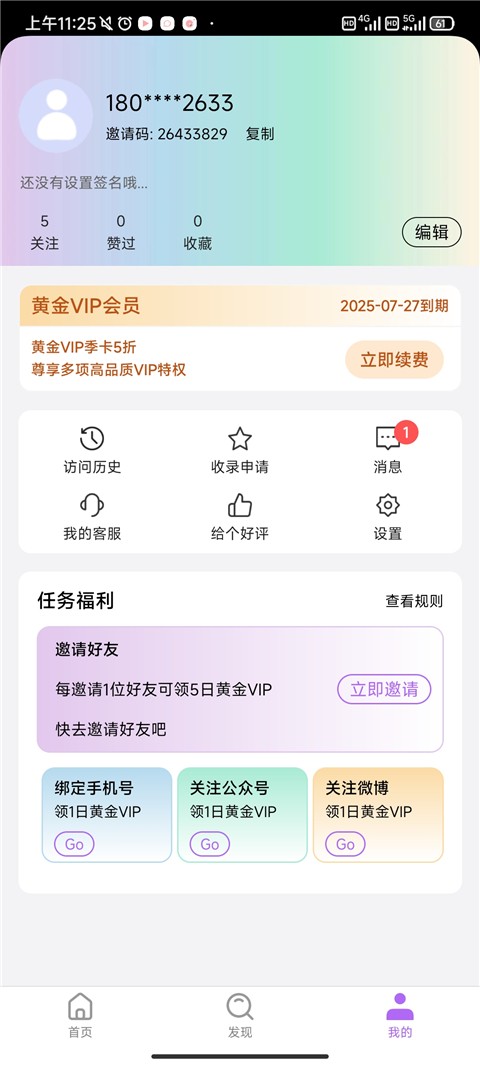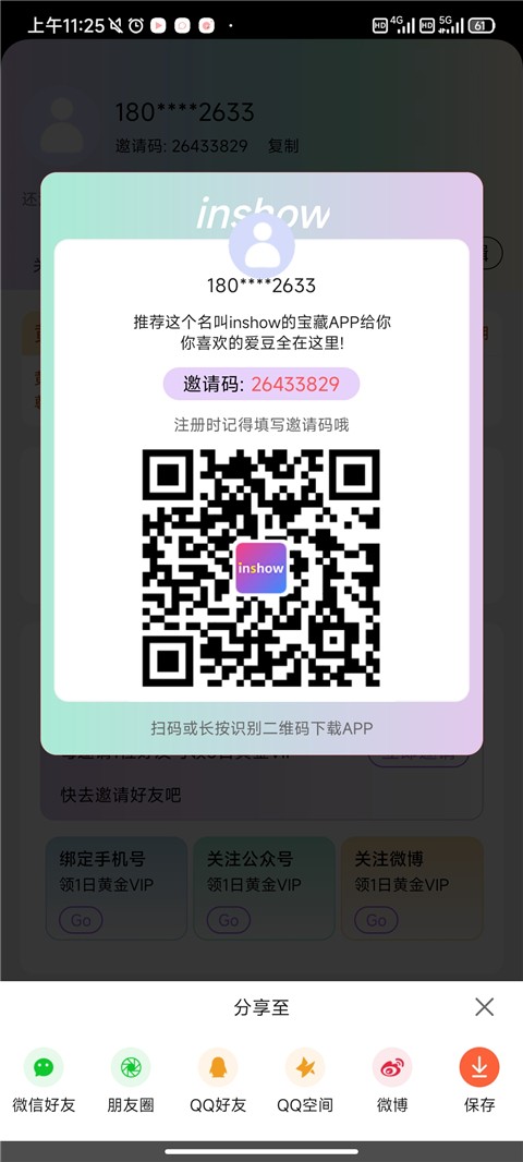 2、接着会出现二维码和邀请码,发送给朋友就可以了,邀请好友还可以获得5日黄金VIP