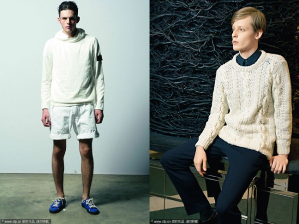 图左模特的造型很有运动风,衣裤都默契地选择白色,白色毛衣更多起到保暖的作用,鞋款的蓝色是点睛之笔。图右模特的穿搭走商务休闲风,衬衫与毛衣的搭配增添的文雅的气质,黑白色比例协调,有安静的美男子之感。