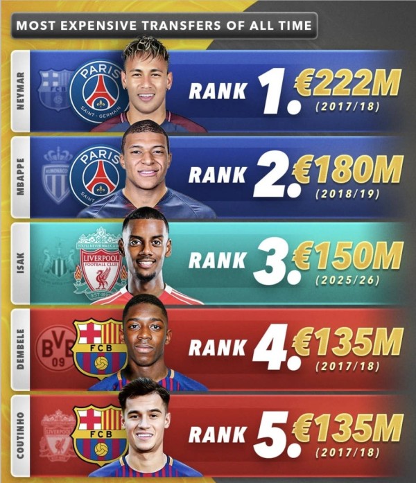 最近,足球史上最昂贵的转会榜单再次引起了广泛讨论(截至北京时间2025年9月1日的数据)。从2.22亿欧元转会费的内马尔到1.20亿欧元的格里兹曼,高价并不总等于物有所值:有球员凭借统治级的表现实至名归(比如姆巴佩),有些人被伤病和角色困扰而未能兑现期望(如登贝莱、库蒂尼奥、阿扎尔等),还有一些新近加盟的球员仍需时间来检验他们的真正价值(比如维尔茨、伊萨克)。