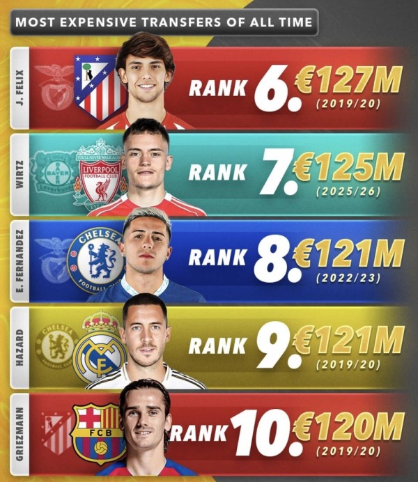 - 若昂·菲利克斯 — 转会费:1.27亿欧元 → 结论:不值得(在马竞期间表现不佳,被多次外租或转会)。
