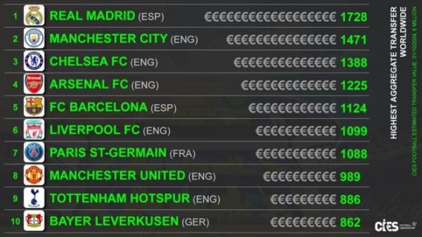 CIES球队转会价值榜:皇马17.28亿欧居首,曼城、切尔西前三