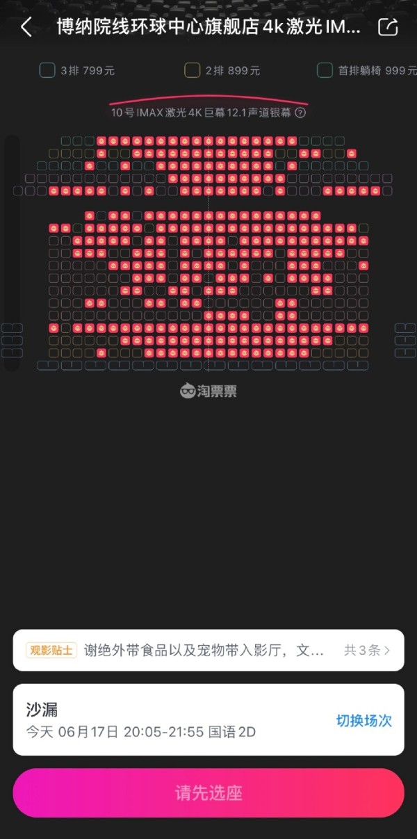 6月17日,电影《沙漏》在成都某影院的一次路演场中,首排票价999元。