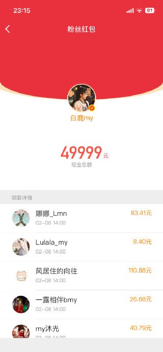 与同期明星普遍设置粉丝等级限制不同,白鹿的红包实现"零壁垒"参与: