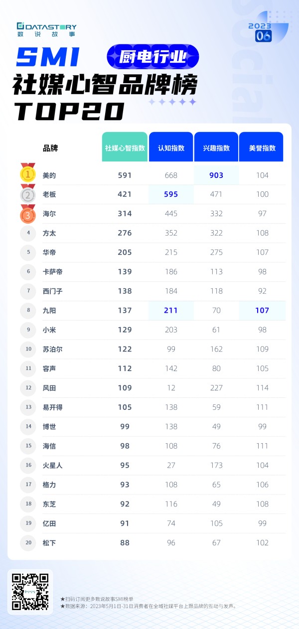 而在最新发布的数说故事6月厨电行业社媒心智品牌榜中,美的续约曼城,强势分拔头筹;老板电器联手王一博,“宠”手开始的温柔,抢跑品牌心智前二;九阳玩转粉丝经济,魅力圈粉新生代,入围前十。