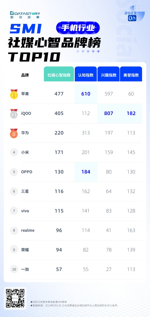 在最新发布的数说故事6月手机行业社媒心智品牌榜中,苹果再次站在“手机品牌话题之巅”,稳坐社媒心智第一;iQOO新品强悍来袭,不仅配置杀疯了,兴趣指数与美誉指数也高能霸榜;OPPO全新“长焦人像”搭配618补贴快车,本月榜单直冲前五。