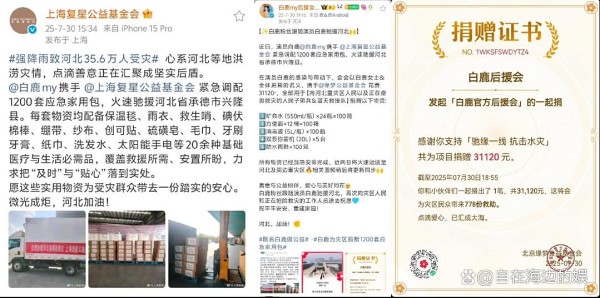 粉丝共振:带动“鹿茸”们以她名义向辽宁葫芦岛捐赠670套儿童应急包,后援会自发捐款5000元抗洪;