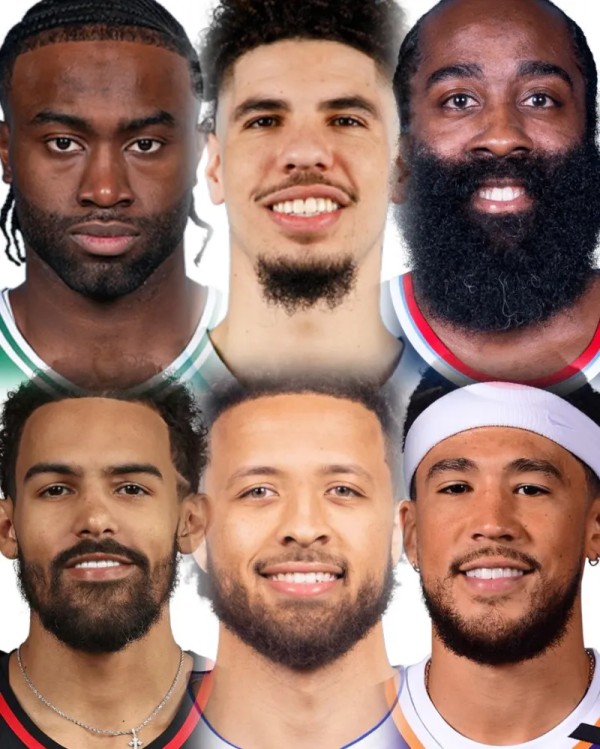 图中六名球员分别是:杰伦-布朗,拉梅洛-鲍尔,詹姆斯-哈登,特雷-杨,凯德-坎宁安和德文-布克。