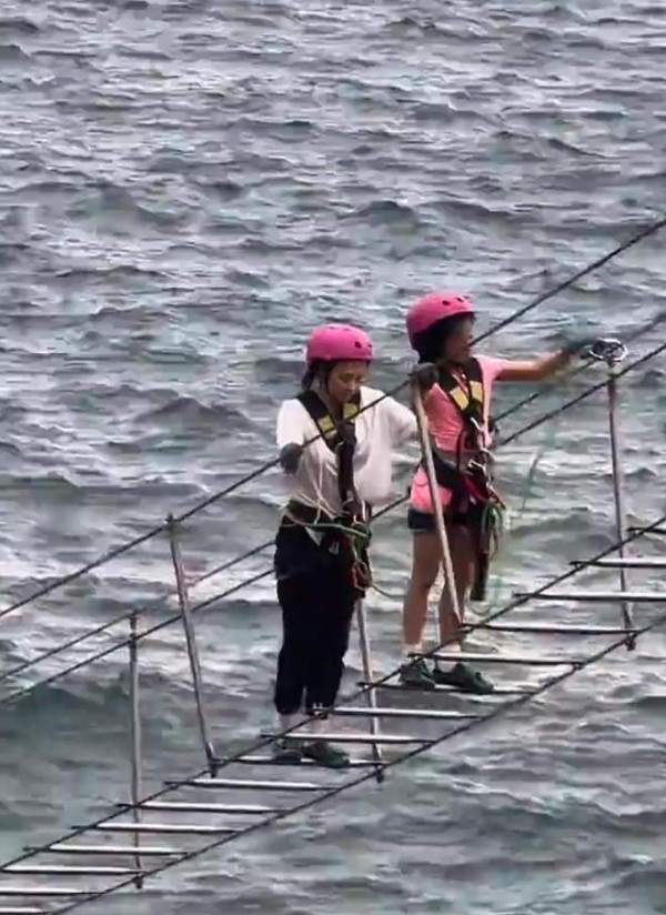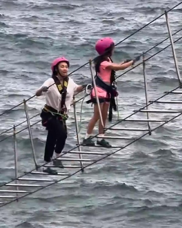 乘坐轮渡抵达景区后,章子怡就和女儿“醒醒”戴上专业的攀岩设备,母女俩小心翼翼地踩着木板往前走,其身下就是深不可测的大海,海上激起朵朵波纹,看一眼就令人害怕。
