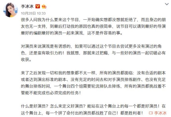 为此,她也曾在某社交平台上发长文解释过这件事。起初她是拒绝参与录制这个节目的,因为自己的演技不需要通过这档综艺节目来录制,并且身边的朋友也表示不建议她来。最后她改变原先的想法,决定参加的原因很简单:好的导演与好的编剧吸引到她了,再加上有好的演员可以切磋。