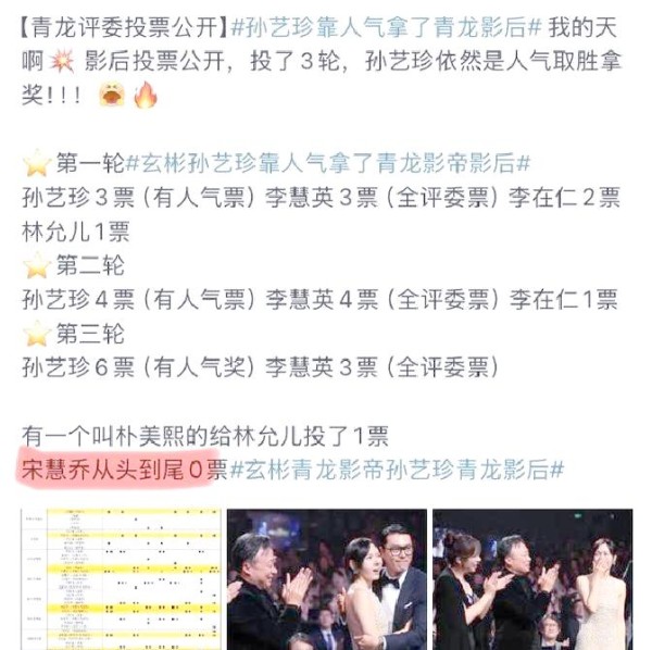 那晚颁奖礼的镜头频频捕捉到观众席和台下观众的表情,他们的情绪被清晰地呈现出来。尽管玄彬与孙艺珍荣获影帝影后,但镜头下的画面并非都是温馨与喜悦。评选过程并非一锤定音,而是经过三轮激烈的角逐。每一轮的票数都详细公布:第一轮,孙艺珍以3票领先,李慧英和李在仁各得3票,林允儿获得1票;第二轮,孙艺珍票数上升至4票,李慧英紧随其后;第三轮,孙艺珍以6票(包括一张人气票)的绝对优势胜出,李慧英最终以3票遗憾落败。这样的票数分布引发了网友们的热议,其中不乏质疑与不满之声。