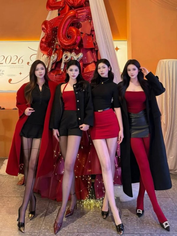 红黑战袍配黑丝,人均腿长一米八,这哪是闺蜜局,这是 “照骗天团” 出道现场。