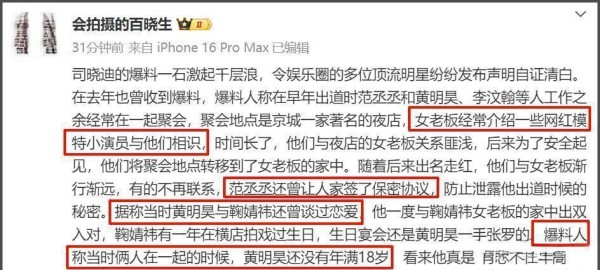这场风波不仅把鹿晗卷了进去,连范丞丞、黄明昊也没能幸免。有爆料说,北京有家夜店的女老板特别喜欢给顶流牵线搭桥,介绍网红模特、小演员认识,而李汶翰、范丞丞、黄明昊都是这家夜店的常客。巧的是,司晓迪的账号里就存着和范丞丞同框的聚会视频,这下子,瓜田直接扩大了好几倍。