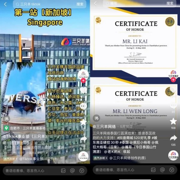 疯狂小杨哥自去年4月起便透露了要在TikTok平台开设电商的计划。2024年1月16日,三只羊网络与新加坡本地知名达人@shopwithsasax合作的首场直播,占据TikTok新加坡地区销售GMV排行榜的首位。