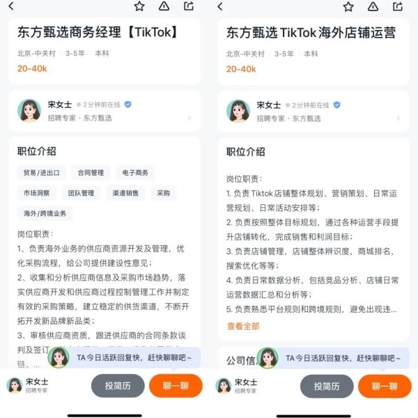 此外,东方甄选发布了多个与TikTok相关的岗位,岗位涵盖TikTok海外店铺运营、运营经理(TikTok)、商务经理(TikTok)等。在进击海外市场方面,东方甄选消息称,会与字节跳动进行合作,这一消息推动了其股价的上涨。
