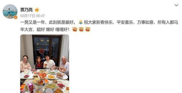 这张年味十足的全家福,无意中展现了一场春节连续剧,被网友们一眼看穿。马年大年初一一过,刘亦菲难得上线发个祝福,没想到深夜里突然抢占热搜的,竟不是她的礼服造型,而是贾乃亮那张看起来平平无奇,却细看能发现满满故事的全家福。说实话,第一眼我并没注意到复婚与否的问题,反而是那桌子上热腾腾的东北菜,瞬间让我食欲大开。一大桌子菜,份量十足,大碗大盘,硬菜全齐:红绿相间,荤素搭配,家常味浓,完全不走花里胡哨的路子。桌子两边坐着爷爷奶奶,笑得眼睛都快眯成一条缝,贾乃亮和甜馨坐在中间,父女俩脸上挂着标准的大笑,透出一股这顿饭真好吃的满足感。
