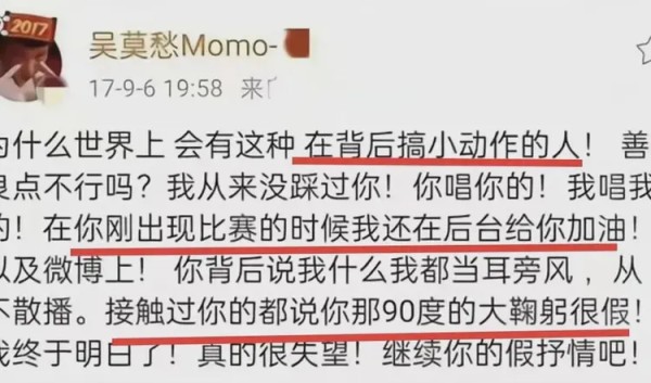 网友扒出,2017年吴莫愁突然连发动态控诉:“直到最近才明白什么叫做人善被人欺”。当时《明日之子》宣传图已放出吴莫愁照片,最终登台的却是张碧晨。更蹊跷的是,此后吴莫愁便遭遇黑料轰炸,事业一落千丈。