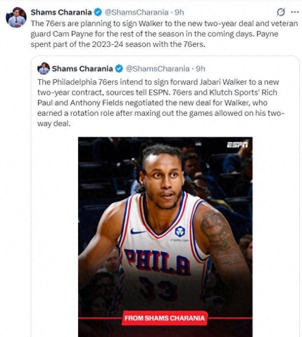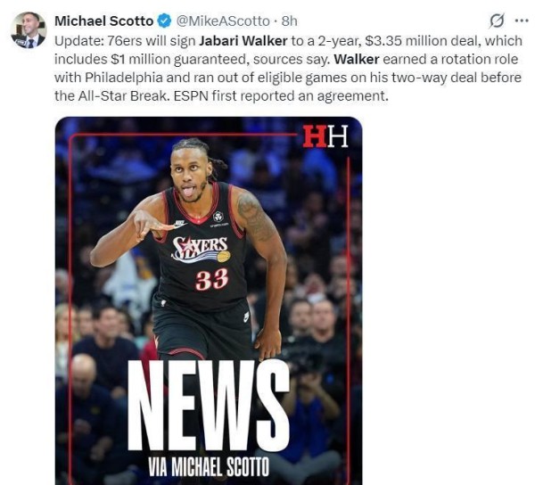 ESPN名记Shams率先报道,76人队决定将沃克的双向合同转为一份为期两年的正式NBA合同。 这份合同总价值335万美元,但其中只有100万美元是保障部分。 对于23岁的沃克来说,这意味着一份稳定的工作和继续证明自己的机会。