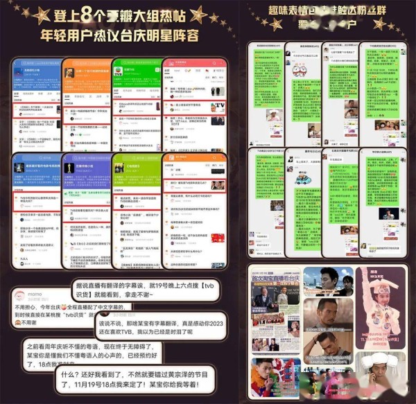 台庆开始之前,趣味海报在“TVB电视剧组”、“综艺爱好组”等豆瓣小组疯传。“巾帼枭雄”康宝燕诚邀伙计们看台庆、“王牌卧底”陈建明已经不想和不知道TVB台庆的人说话了,脑洞大开的海报预热勾起了当年追剧的美好回忆,组员们热烈讨论的同时,也主动分享一键观看TVB台庆直播的“教程”。