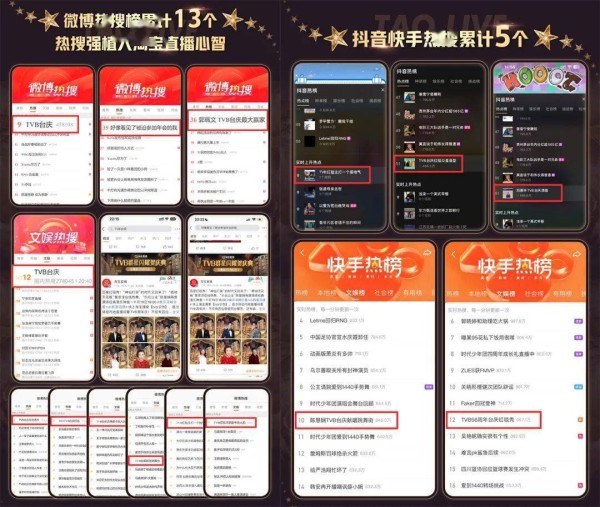 现场欢乐的气氛一直延伸到直播场外,各大平台的讨论热度居高不下。快手上“TVB台庆红毯众星造型”引热议,“刘德华TVB台庆清唱”登上抖音热榜,截至落幕,TVB 56周年台庆在全网总曝光近10亿,18个微博热搜先后霸榜。