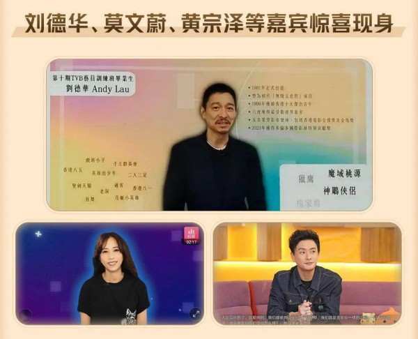 现场天王天后的惊喜现身,将直播热度推上巅峰。刘德华清唱一曲《影帝无用》,希望以此勉励后辈;情歌天后陈慧娴献唱经典歌曲《回家》、《跳舞街》,坚定有力的嗓音让人梦回神仙打架的年代。
