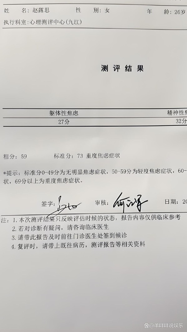 更引人注目的是,赵露思附上心理测评报告,显示其患有“重度焦虑症状”与“重度抑郁症状”。这与此前她公开的抑郁症病史(2025年初体重降至36.9公斤)形成呼应,揭示出长期高压对艺人身心健康的摧残。