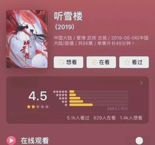 《听雪楼》自播出以来,便 饱受争议,豆瓣评分低至4.5分。粉丝们对这部剧的吐槽可谓全方位无死角,从剧情到主演,再到服化道以及武打动作,无一幸免。而其中,最为猛烈的吐槽莫过于“ 毁原著”这一观点。