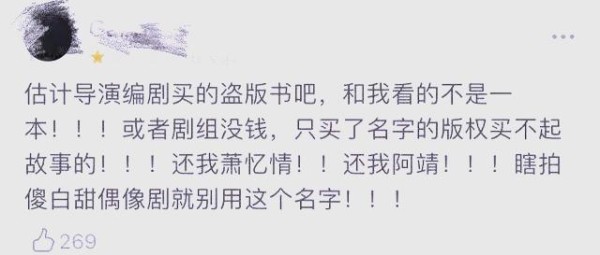 将一部原本的虐恋故事改编成如今这种狗血玛丽苏剧情,无疑引起了小说原著粉丝的强烈不满。他们纷纷质疑:为何要改变原本精彩的虐恋情节,而去追求那种俗套的、类似于傻白甜与霸道总裁的狗血武侠剧呢?