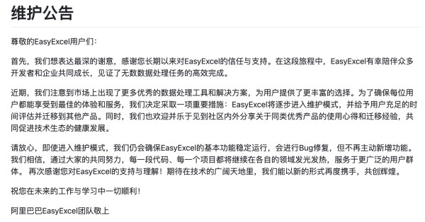 公告中表示,Easy Excel 将进入维护模式,会进行 Bug 修复,但不再主动新增功能。其实约等于停止更新了,只不过是一种委婉地表达罢了。