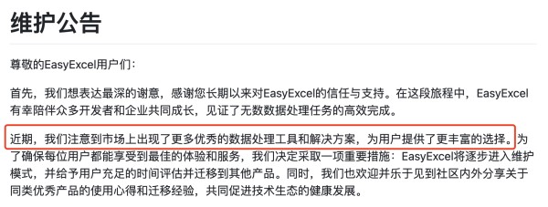 这也是我乐意使用 Easy Excel 的原因,但是官方公告中的有一点我还挺在意的: