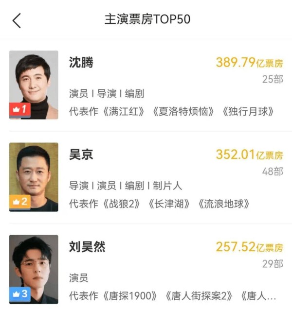 随着《飞驰人生3》的热映,演员沈腾的主演电影票房累计已突破389.79亿元,登顶主演票房榜第一,吴京和刘昊然紧随其后。目前,《飞驰人生3》的预测票房为42.75亿元,沈腾有望凭本片成为首位主演电影票房破400亿元的演员。