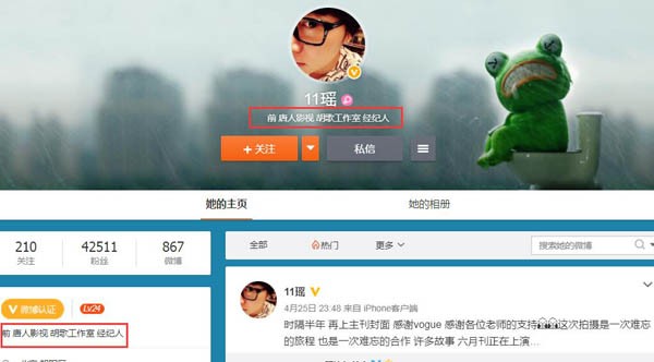 而看姚瑶的工作微博“11瑶”,其中微博认证地方已经改成了“前唐人影视胡歌工作室经纪人”,所以这位确定已经不再跟胡歌有任何牵连。