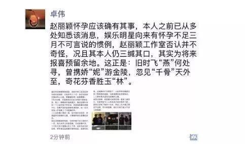 赵丽颖的这时突然宣布停工不免引猜疑,卓伟更是在网上放话,颖宝已经怀孕