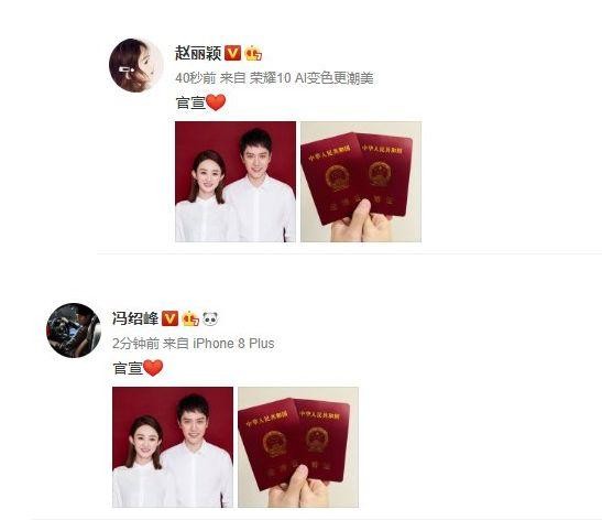 恭喜~~冯绍峰赵丽颖官宣结婚