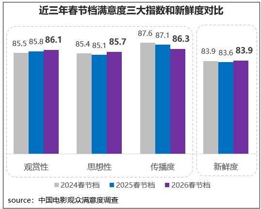 观众对2026年春节档在故事创作、视听呈现和思想表达上的创新突破给予了较高的认可,档期观赏性86.1分、思想性85.7分,分别同比增长了0.3分、0.6分;新鲜度83.9分,同比增长0.3分。