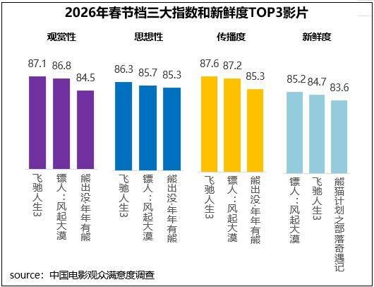 中国电影观众满意度调查・2026年春节档调查结果显示,春节档满意度稳中小幅提升至86.0分,近三年呈持续增长趋势。档期经典IP与创新作品齐聚,喜剧、武侠、科幻、动画、剧情等多元类型同期绽放。调查的六部影片中,《飞驰人生3》和《镖人:风起大漠》以超86分的满意度领衔,其余四部均超83分。