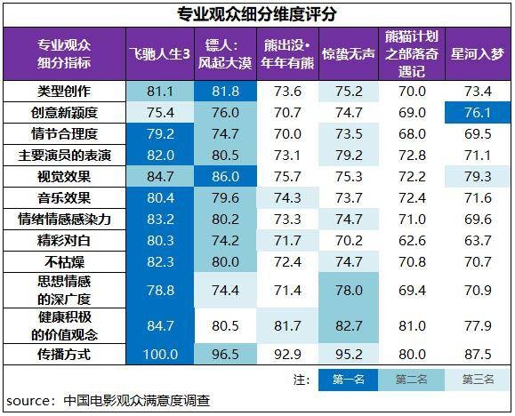 专业观众评价中,《飞驰人生3》获得了12项指标中的9项最高分评价,其中情绪情感感染力、健康积极的价值观念、不枯燥、主要演员表演得分都超过82分;《镖人:风起大漠》的类型创作、视觉效果居首位,其中视觉效果以86分创下了整个档期专业观众细分指标(不含传播方式)中的最高分;《星河入梦》的创意新颖度居首位。此外,《惊蛰无声》思想情感的深广度和健康积极的价值观念指标居档期第二,《惊蛰无声》主要演员表演、《星河入梦》视觉效果和《熊出没・年年有熊》的健康积极的价值观念、音乐效果等指标位列第三。