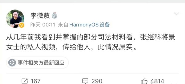 3月31日,又有博主发文,称张继科确实传播了女演员隐私视频,并且引发了刑事案件。