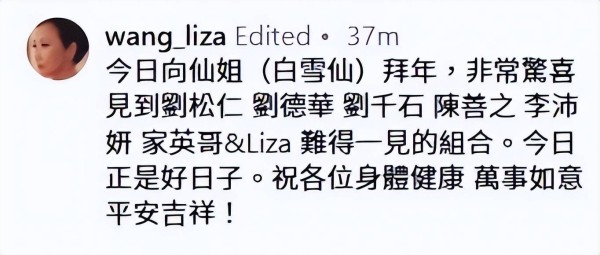 汪明荃在社交平台上兴奋地写道:今天向仙姐(白雪仙)拜年,非常惊喜见到旧拍档刘松仁、刘德华、刘千石、陈善之、李沛妍、家英哥和Liza,真的是难得一见的组合。她形容当天是好日子,并向大家送上了新春的祝福:祝各位身体健康,万事如意,平安吉祥!的确,像这样一群明星聚在一起,真的是难得一见的景象,就算是提前约好也未必能这么完美地凑齐。汪明荃的分享,也勾起了不少人的怀旧情绪,大家纷纷评论这是一张世纪大合照。