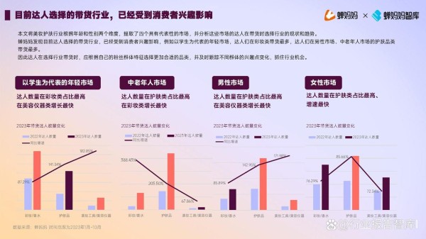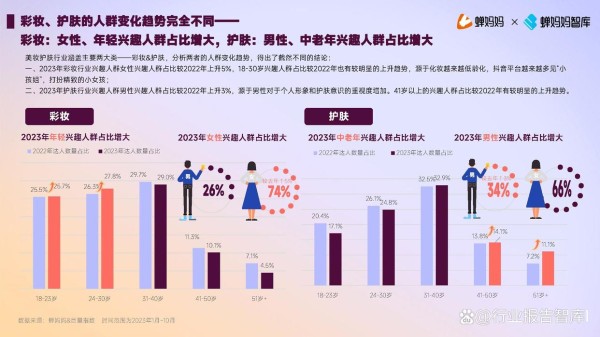 达人入局的行业受到消费者兴趣的影响,尤其是在彩妆和护肤市场。彩妆市场中,女性和年轻兴趣人群占比增大;而在护肤市场中,男性和中老年兴趣人群占比增大。