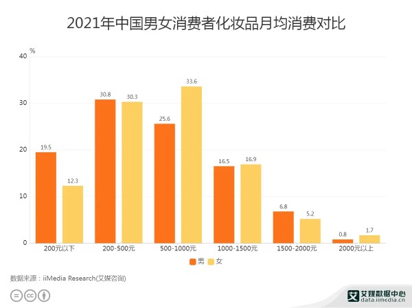 艾媒咨询数据显示,2021年中国男性消费者占比最多的是每月消费200-500元(10.8%)、而女性占比最多的是每月消费500-1000元(33.6%)、男女双方在2000元以上的占比是最少的(0.8%和1.7%)。艾媒分析师认为,男性购买化妆品更多倾向于基础遮瑕产品,所以每月花费并不会太多。但是女性每月除了购买基础产品外,还会购买其他产品,比如眉笔、口红、防晒隔离、定妆粉等等,因此开销较男性更多。