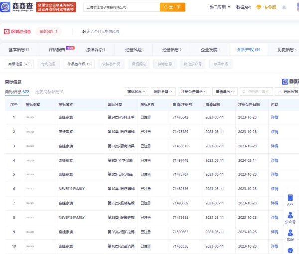 根据商商查资料显示,美ONE旗下上海妆佳电子商务有限公司早在2023年10月便大量注册了关于“奈娃家族”的商标信息,可以看出他们对于“奈娃家族”咖啡店的发展早有规划。