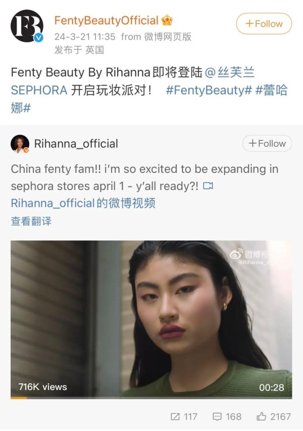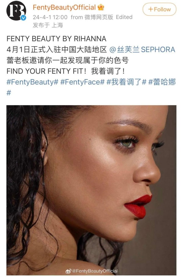 4月1日中午12时,Fenty Beauty by Rihanna(以下称Fenty Beauty)通过官方微博,宣布入驻丝芙兰中国大陆市场的消息,正式回应其品牌创始人蕾哈娜于3月21日在社交媒体发布的布局中国大陆线下渠道的预告。蕾哈娜对中国市场展现了特别的关注,她说:“中国丰富的文化底蕴一直激励着我,我迫不及待地想与你们分享这个品牌。”