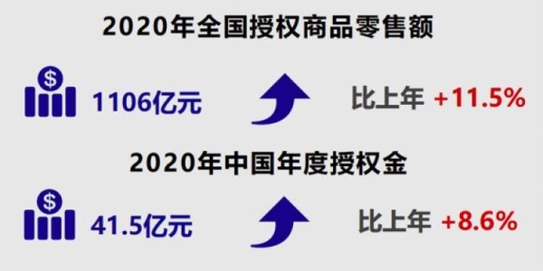2020年我国年度被授权商品零售额达1106亿元人民币,同比增长11.5%;年度授权金41.5亿元,同比增长8.6%。