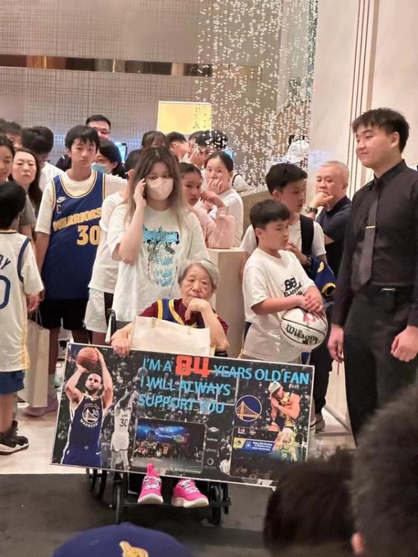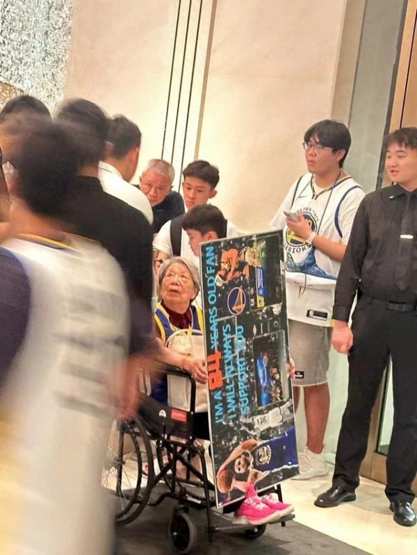 热爱不分年纪!84岁老奶奶球迷坐在轮椅上在酒店大堂等待库里现身