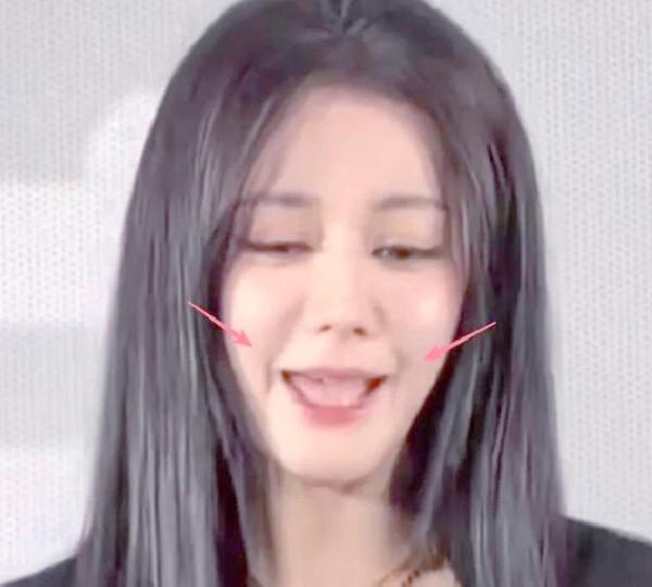 尽管经过修饰,她脸上的浮肿仍然显而易见,脸颊显得圆鼓鼓的,苹果肌也鼓胀起来,使得面部线条变得模糊。从侧面看,下颌线也不再清晰,骨感不再那么明显。在某些角度下,甚至能看到她脸上泛着油光。当她坐着不动时,脸上的浮肿就变得十分明显,而做表情或笑起来时更是如此。笑或说话时,口周会出现不对称的情况,下嘴唇向右偏移,做出表情时鼻翼两侧的法令纹也会显现出来,面部的表情皱褶也因此更加明显。有人将这组现场照片与剧中的镜头进行对比,发现她在剧中的面部骨相更为突出,而在现场照中则显得更加圆润,肉感明显。对于这一现象,现场照片与剧中角色的对比引发了关于面部状态和医美猜测的热议。