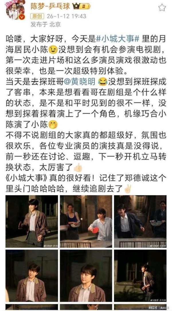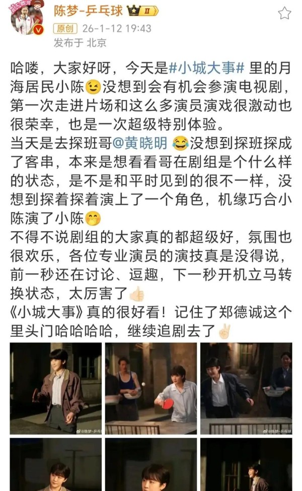 首次参演电视剧!陈梦发文回应,黄晓明互动:全面肯定!陈梦客串黄晓明新剧文体两开花陈梦本色出演乒乓球高手