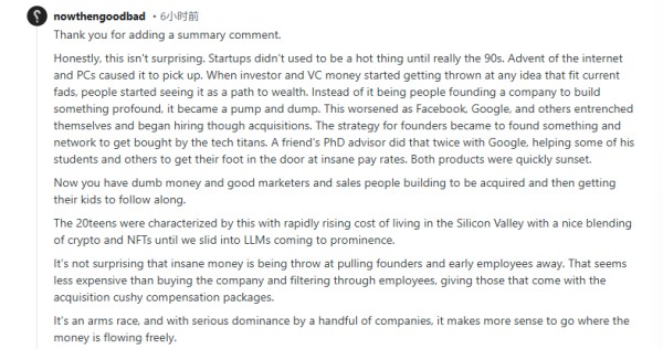 一名投资人称“这并不奇怪。当风投热钱追逐每一个泡沫概念时,创业的本质就变了——它不再是构建持久的事业,而是一场‘拉高出货’的游戏。谷歌、FB等巨头们用收购代替招聘,这让创始人的策略变为:创业、运作人脉、等待被收购。我认识的一位导师曾两次帮学生这样操作,项目只为换取谷歌高薪,随后便被废弃。如今,是‘傻钱’和销售人员在主导创业,目标从创造变成了套现。”