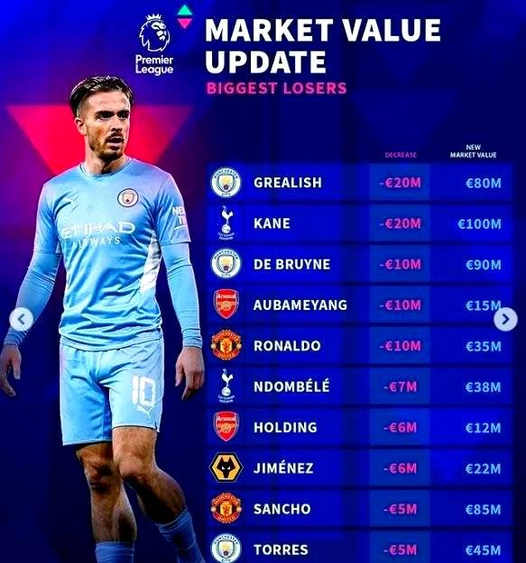 近日,德国知名体育数据网站《转会市场》更新了五大联赛球员身价下滑的最新榜单。在英超联赛中, 格拉利什和凯恩的身价大幅下滑,分别减少2000万欧元,德布劳内下滑1000万欧元。知名球员C罗也位列其中,其身价下跌了1000万欧元。