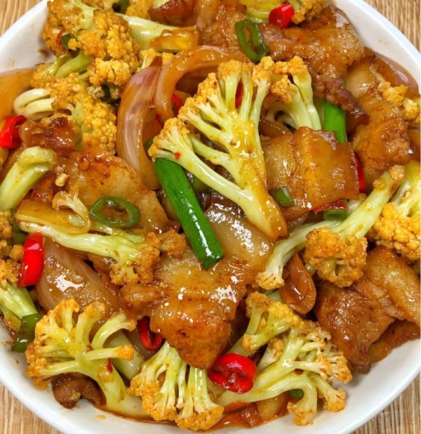 干锅花菜 富含膳食纤维,有助于促进消化,同时含有多种维生素,对眼睛保健大有裨益。