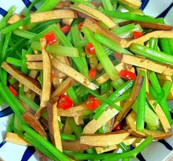香干炒芹菜 富含蛋白质和膳食纤维,有助于维持肌肤弹性和促进肠道健康。